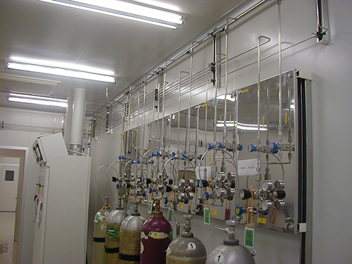由於純(chún)度為99.8%以上的液氨可以裝入鋼(gāng)瓶出售(shòu),所以通常可直接使用,在室(shì)溫下有0.8MPa左右的壓力(lì),如果使用氨用減壓閥降至常壓放出後,就(jiù)可得到純(chún)度很高的氨氣。如為了除(chú)去(qù)微量油(yóu)蒸氣、二氧化碳等需要特別提純幹燥,可使氨氣通過活性炭後再通過裝有堿(jiǎn)石灰或固體氫氧化鈉、金屬鈉絲等一係列的幹燥管,最(zuì)後通過五氧化二磷(lín)完全幹燥(zào)。